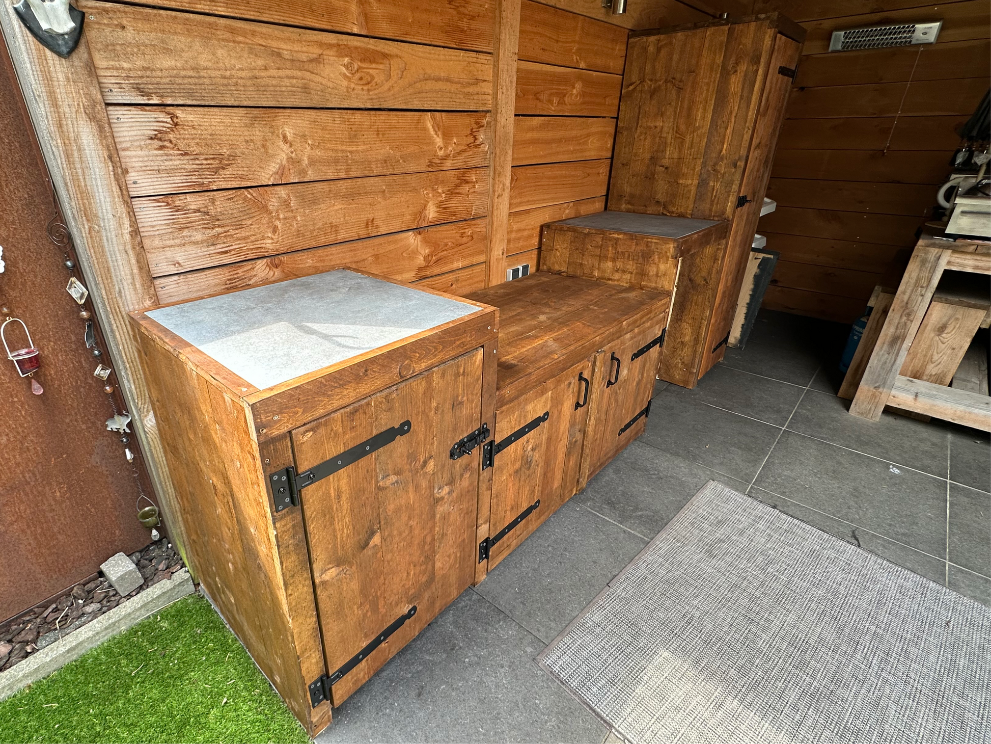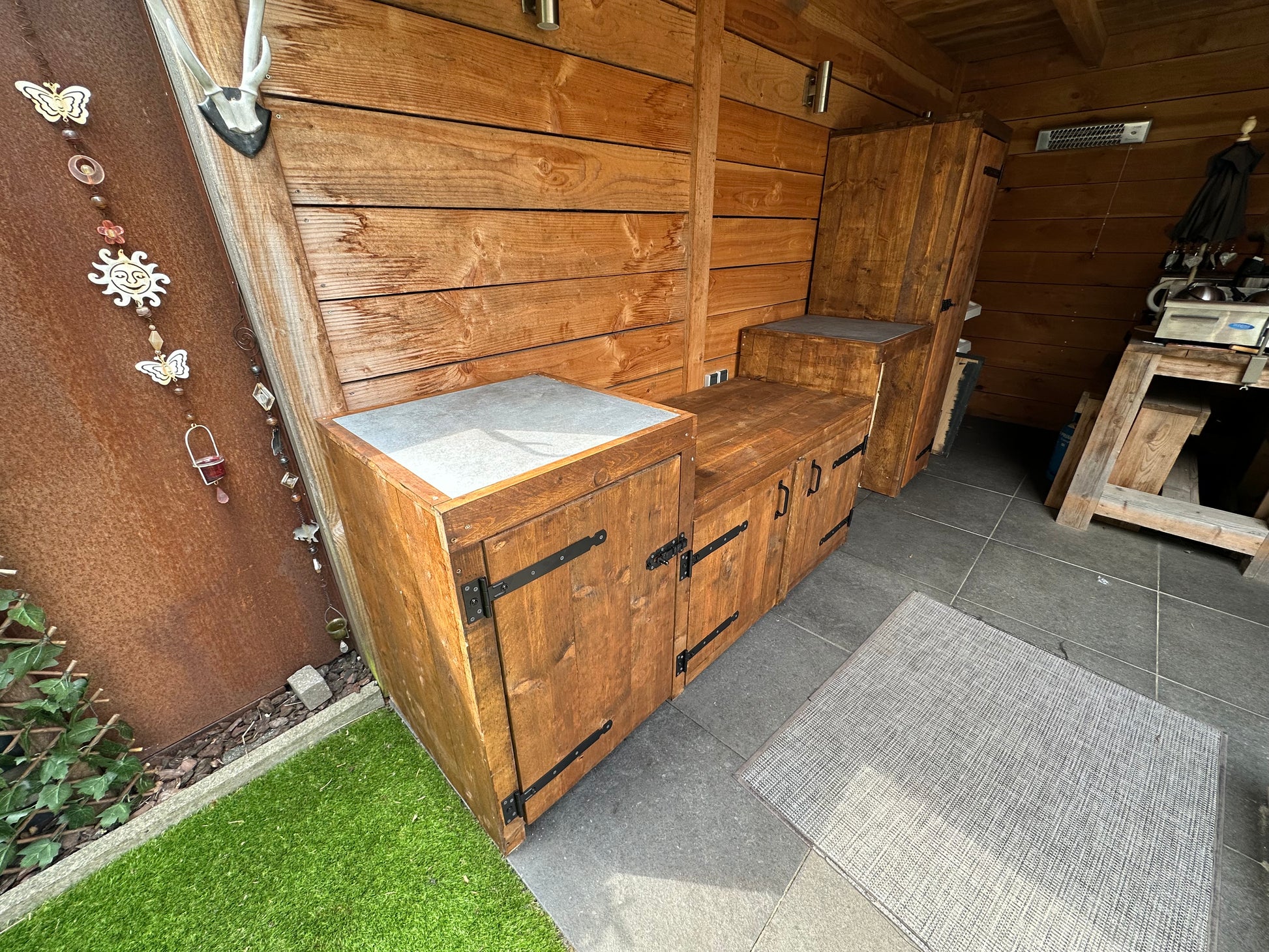 De buiten keuken heeft 2 tegel en is bruin gebeitst.